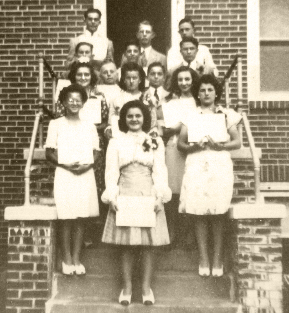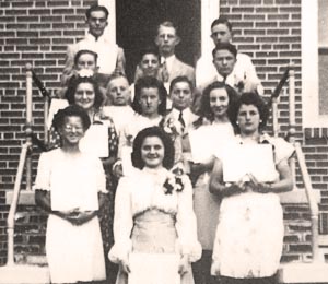 8th Grade Graduation, 1945: BOTTOM: Ruth Harris, Midred Parkell, Marion Evans; 2nd ROW: Eleanor Finley, John Faichney, Doris Dawson, Elwood Sheffield, Doris Griffin; 3rd ROW: Earl Pancoast, Edward Sheffield, Donald Rhubart; TOP: Reeve Pancoast, Frank Norris, Charles Wible.