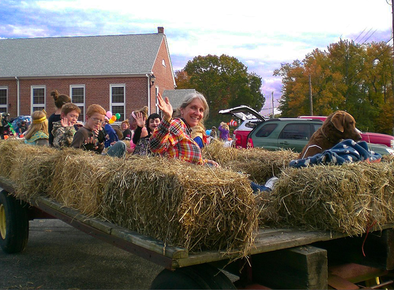 Carol Winchell and Scooter chaperone a Trunk or Treat hay ride