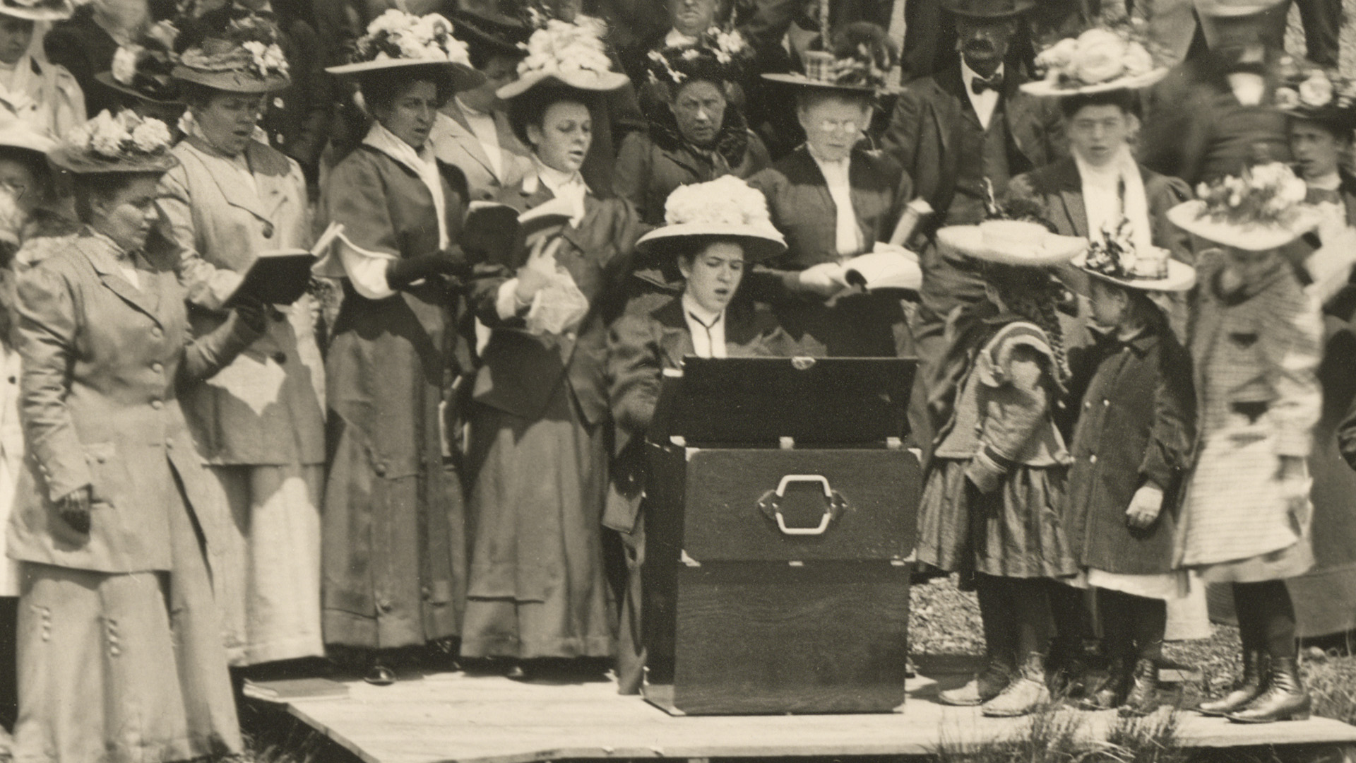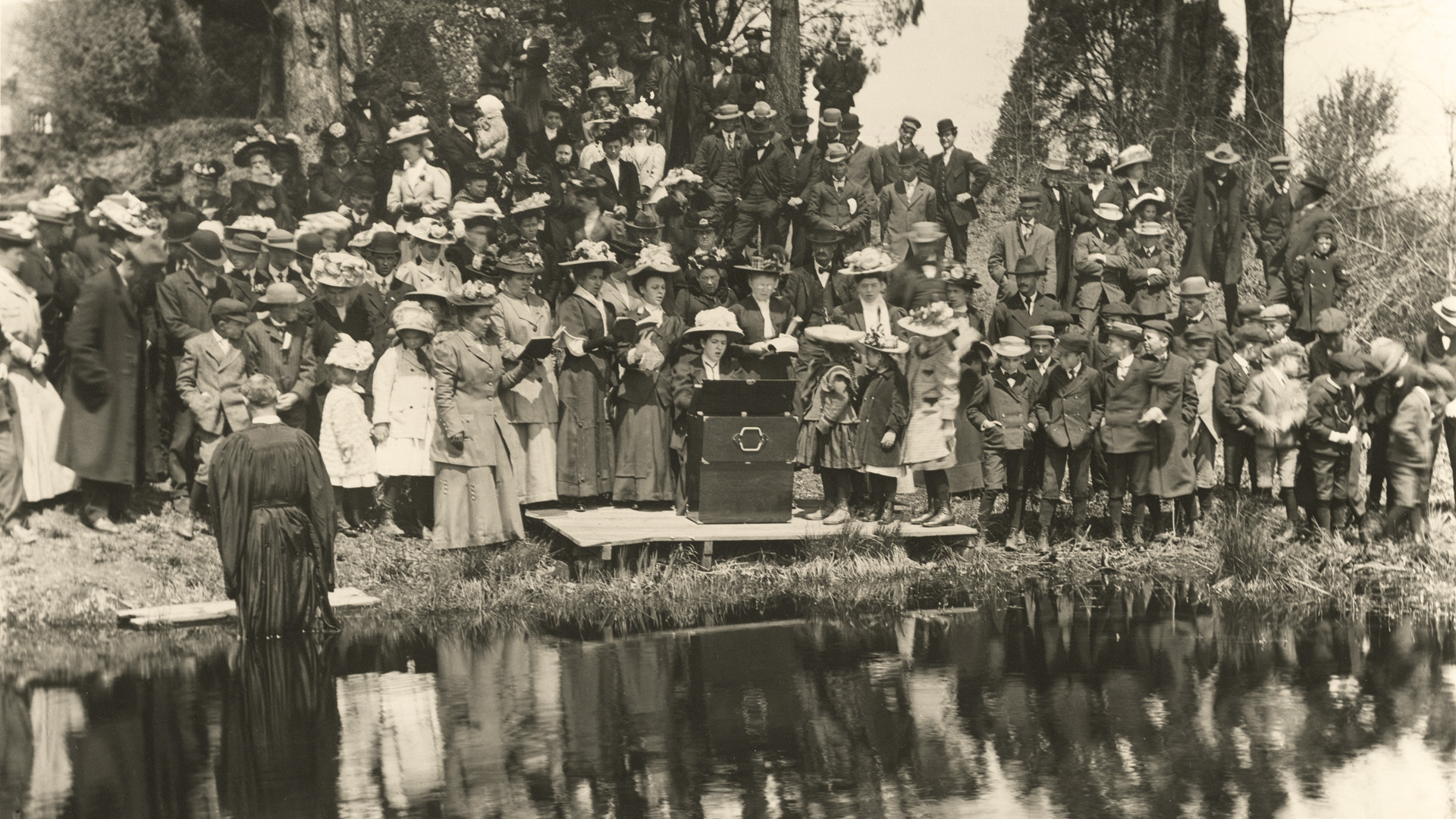 Baptisms in Canton Drain, showing organist with portable reed organ, 1909