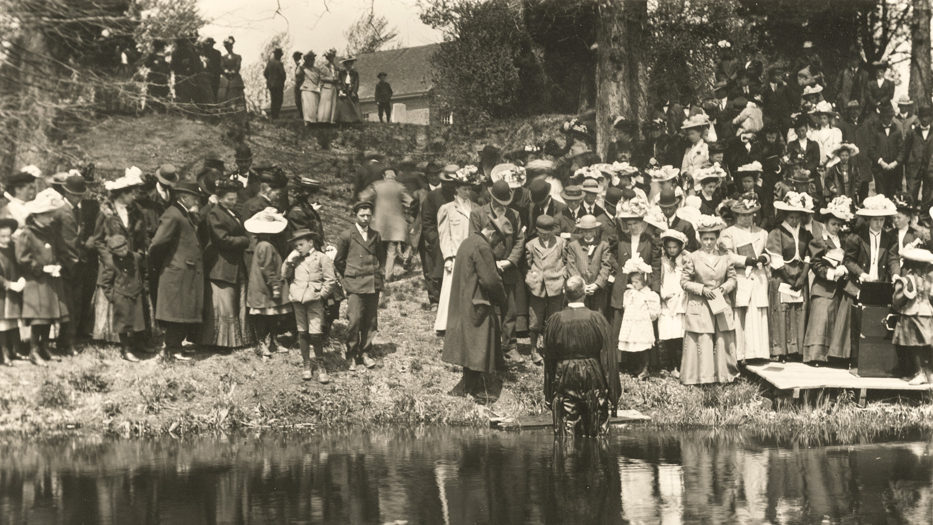 Baptisms in Canton Drain, church in background, 1909