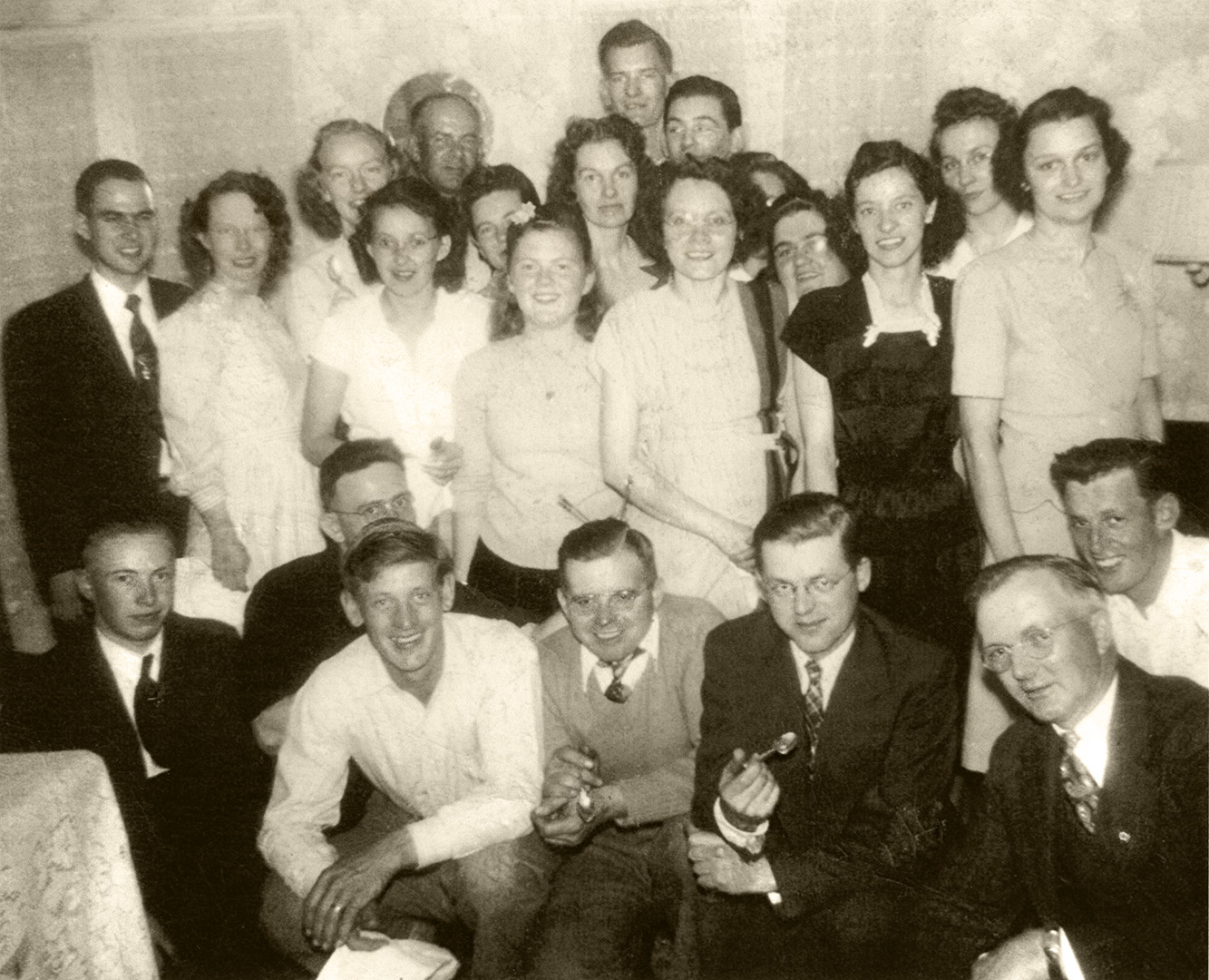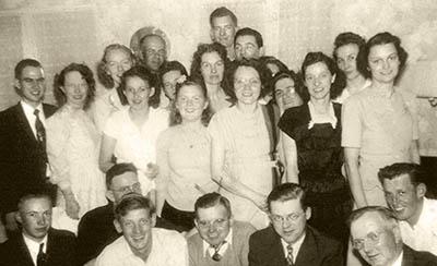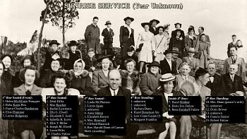 Sunday school 1948: BOTTOM: Leon Hill, Wallace Cates, Bill Johnson, Linwood Dilks, Joe Smick, Lester Finlaw, Albert Bell; MIDDLE: Rev. Glenn Camper, Jean Camper, Lillian Johnson, Viola Hill, Mildred Cates, Sarah Richie, Doris Bell, Jeanette Smick; TOP: Elizabeth Scull, David Dawson, Frances Hanby, Marjorie Dilks, Bill Scull, Bill Hanby, Frances Finlaw, Rena Finlaw.