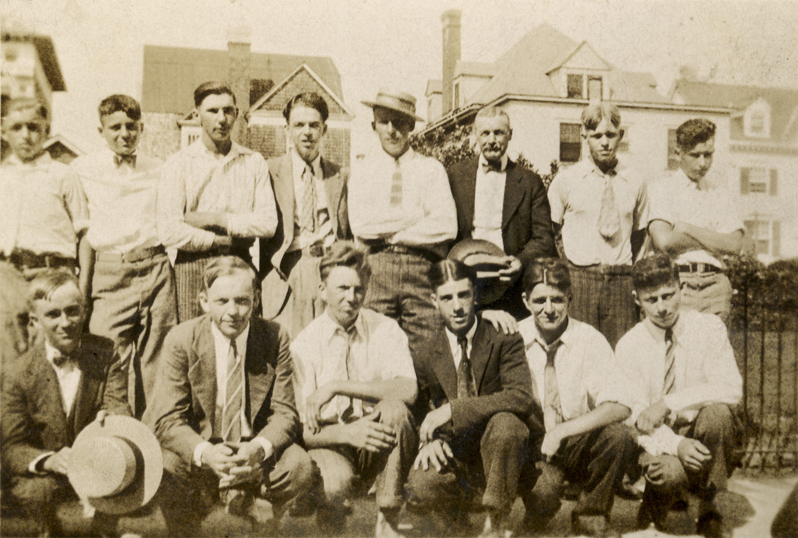 Benj. Plummer's SS Class in Wildwood: (standing) J. Finlaw, W. Parkell, C. Plummer, H. Smith, L. Fogg, B. Plummer, E. Sheppard, F. Smick, (kneeling) H. Shimp, A. Fogg, L. Finlaw, H. Lark, F. Donelson, T. Elwell