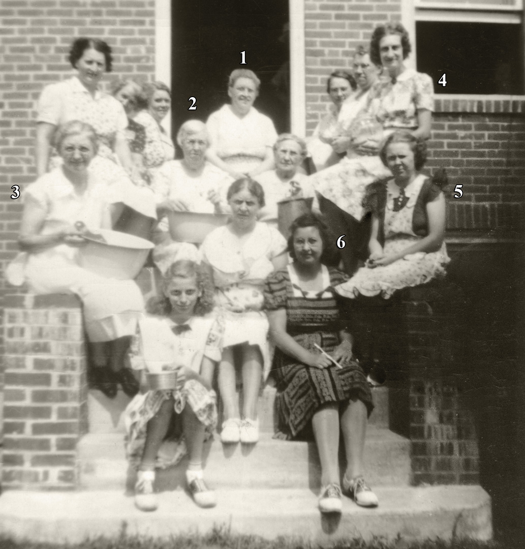 ca. 1945: Too many cooks spoil the broth? 1-Rebecca Fogg; 2-Mae Rascher; 3-Ethel Dilks; 4-Evelyn Vanneman; 5-Laura Dilks; 6-Lillian Johnson