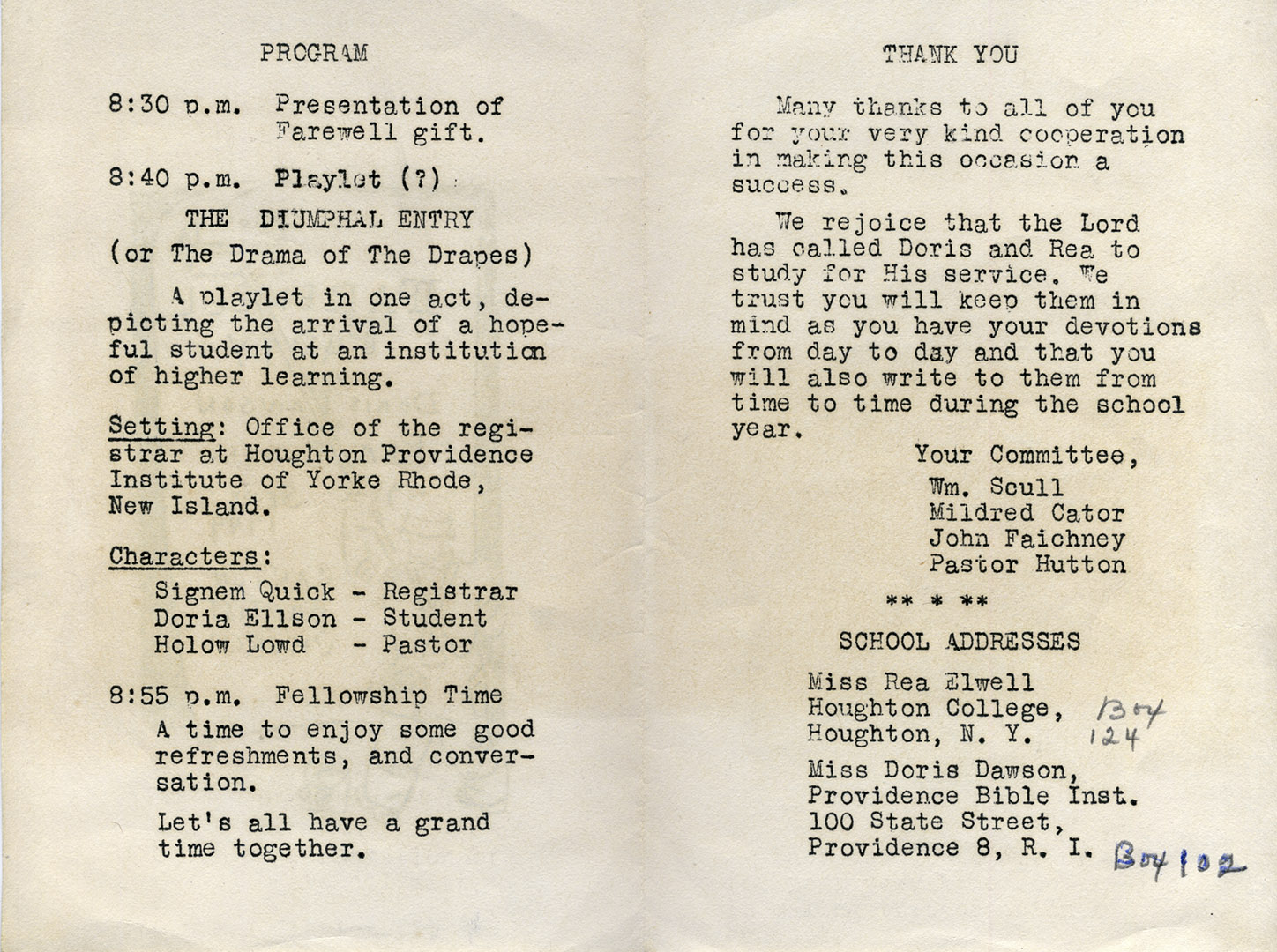 1949: Program, farewell party for college freshmen
