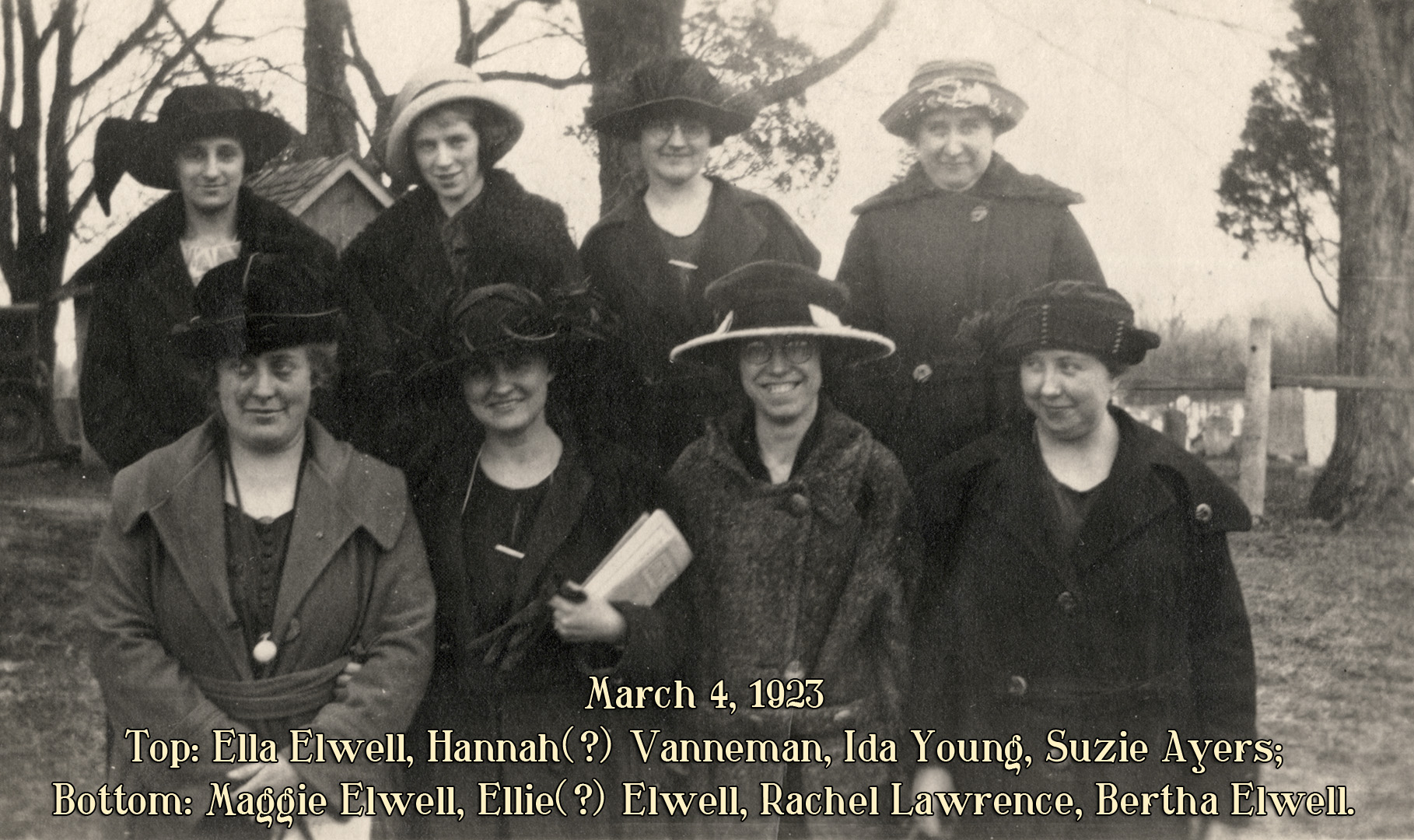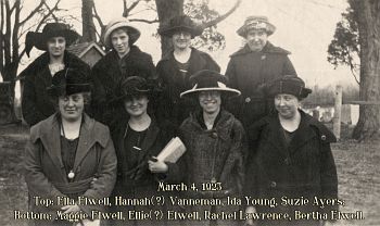 3/4/1923: Top-Ella Elwell, Hannah(?) Vanneman, Ida Young, Suzie Ayers; Bottom-Maggie Elwell, Ellie(?) Elwell, Rachel Lawrence, Bertha Elwell