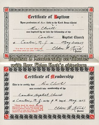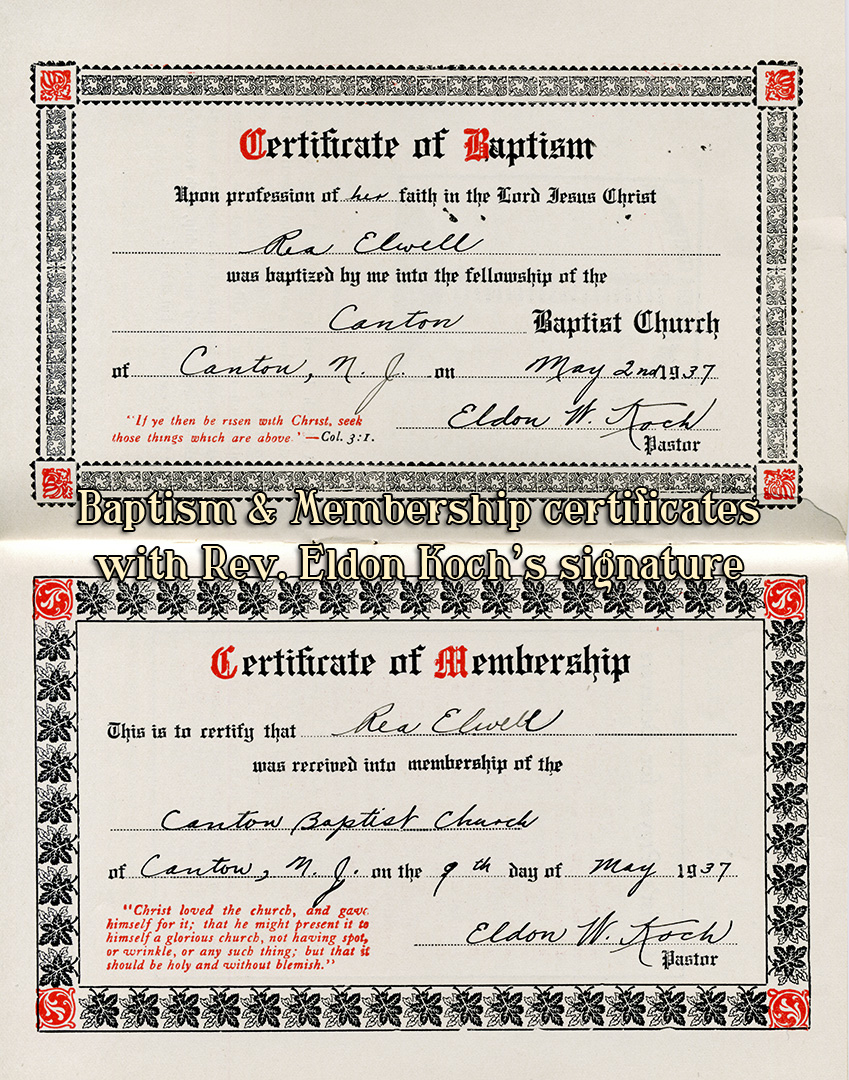 1937: Certificates of baptism & membership, with signature of Rev. Eldon W. Koch (1937-1940)