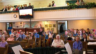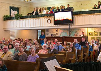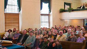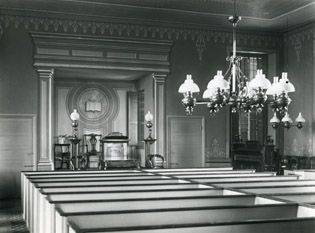Sanctuary interior, 1909 (a few of these pews are still in use in the balcony)
