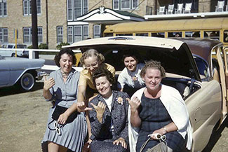 Planning to sneak into the drive-in? Early 1960s: Jean Wible, Libby Scull, Doris Hartshorn, Rea Elwell, Isabelle Bradway
